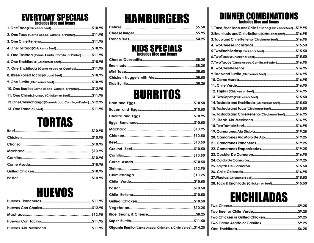 La Hacienda offers a straightforward and inviting menu that focuses on classic Mexican dishes, perfect for casual dining any time of day. Whether you’re stopping by for a quick lunch or settling in for a relaxed dinner, the menu provides a range of comforting options that complement the warm, friendly atmosphere of this family-run spot.